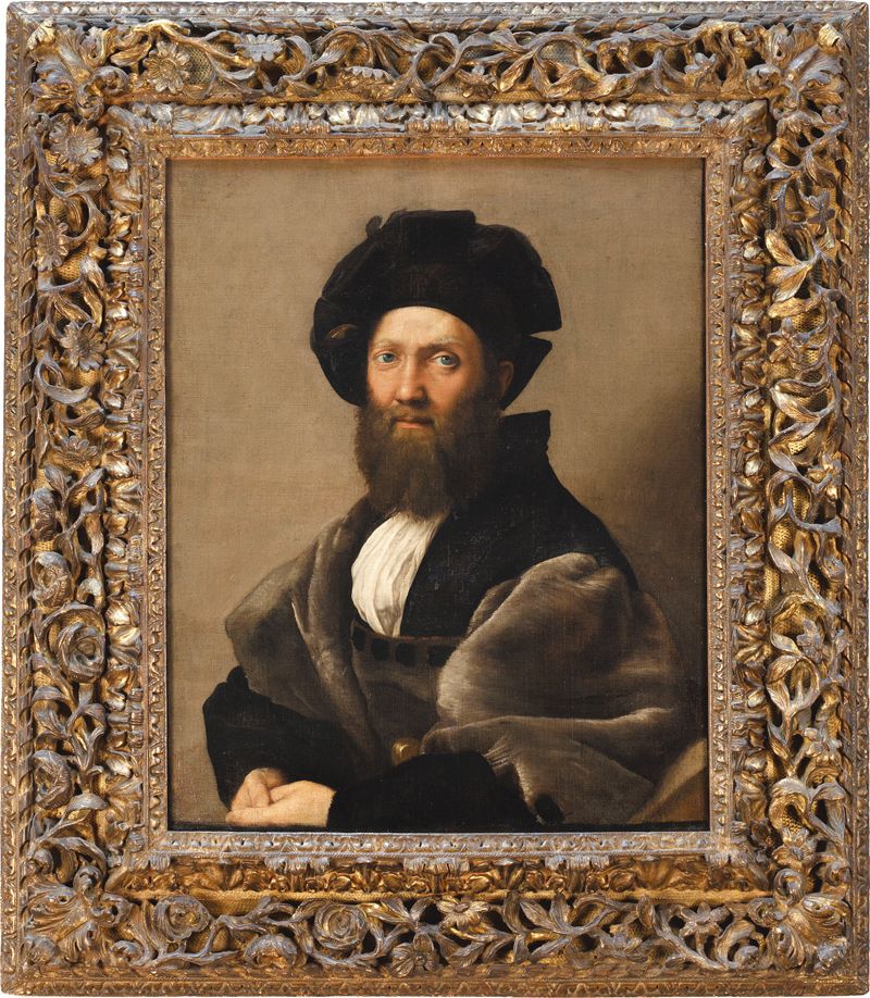Il s’agit du diplomate Baldassare Castiglione, poète et écrivain. Raphaël invente ici le « portrait d’ami » et réalise l’un des chefs-d’oeuvre de la peinture européenne. Il maîtrise à la fois un réalisme sans égal, une sensibilité exacerbée et une virtuosité picturale exceptionnelle. Le tableau est entièrement composé, avec une évidente sobriété, dans une gamme froide de gris, vert olive, noir et blanc. Et remarquez les yeux gris-bleus du modèle, à la fois tristes et sarcastiques. Le peintre signale de manière plus discrète, mais définitive, l’avènement d’un nouveau pouvoir, imposé par la Renaissance et confirmé durant les xviie et xviiie siècles, celui des intellectuels et des scientifiques.