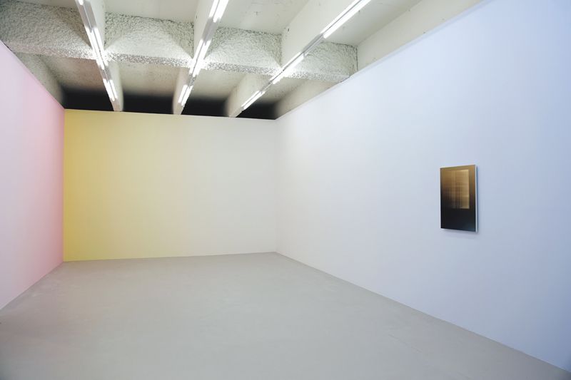 L’architecture définit l’espace, délimitant notamment l’intérieur et l’extérieur. Ici, je tente de transformer cette architecture, ces murs, durs et très physiques, en quelque chose d’immatériel. J’applique alors une couleur sur le mur en respectant un dégradé de 30%. Le contraste entre la couleur, le blanc et les tableaux qui sont posés sur ces murs troublent notre perception. Ces tableaux sont des peintures, très réalistes, de photographies abstraites. On ne sait alors plus ce qui est matériel ou immatériel. Je cherche également à saisir la temporalité : le dégradé représente le temps qui passe, irréversiblement.