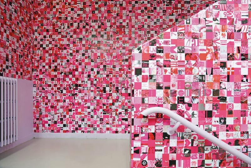 J’ai créé une tapisserie pour l’escalier du Tripostal, passage obligé pour passer d’un niveau à l’autre. Pourquoi ? Je viens d’un milieu très populaire où nous étions sept enfants. Il y avait la chambre des garçons, celle des filles et celle des petits. Or, le choix d’un papier-peint déterminait les cinq années à venir, c’était très important. Cette tapisserie est constituée d’images découpées dans les journaux, la publicité, des flyers… Je les taille au format 6,6 x 6,6 cm, le format ecta, très utilisé dans la presse. Ensuite, je compose 50 pages en collant sur chacune d’entre elles 35 images différentes. Puis, je les photocopie en couleurs. Ce sont donc des milliers de vignettes qui recouvrent le mur et, parfois, le plafond. On peut parfois retrouver le même motif, mais jamais dans le même sens ou la même combinaison. Je joue avec le rose et le fuchsia, qui étaient la couleur de la Galerie Perrotin en 1993, mais pas à la mode dans l’art contemporain, plus sensible au gris, noir et blanc.