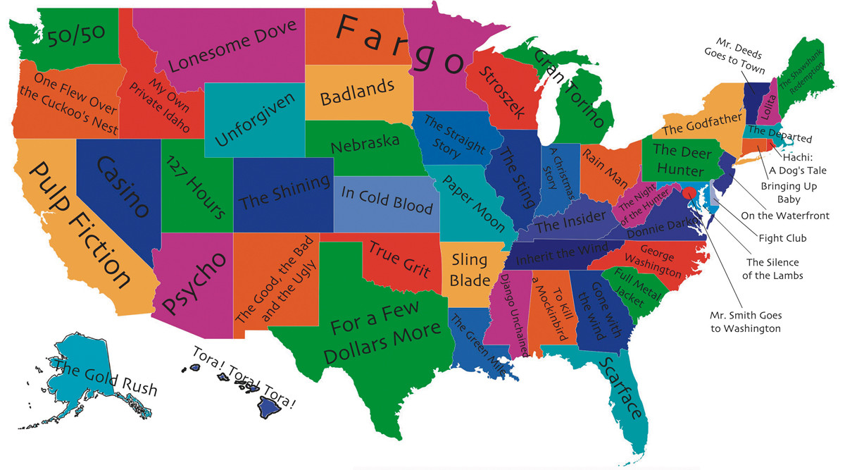 Les Américains sont nuls en géographie, l’affaire est entendue. De réguliers sondages prouvent que pour eux, le soleil tourne autour de la Statue de la Liberté, la France est voisine du Botswana et la Belgique, des îles polynésiennes. Mais ils adorent le pop-corn et, par la force des choses, le cinéma. D’où cette carte reposant sur des bobines célèbres : chaque état est remplacé par le film préféré de ses habitants. Au vu du résultat (Pulp Fiction en Californie, Le Parrain à New-York…), c’est assez chauvin. À moins qu’ils ne connaissent que leur état ?