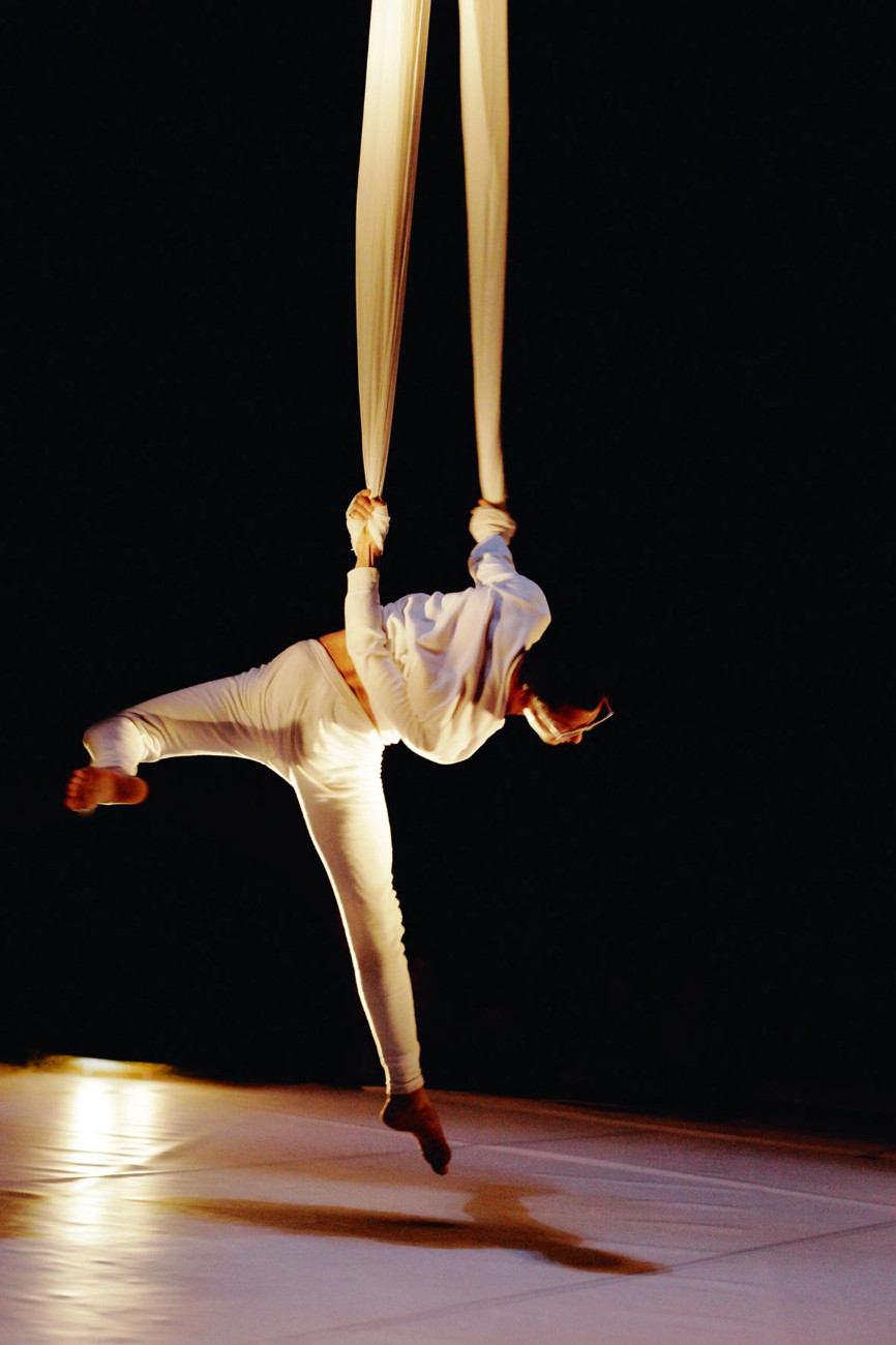Les Escargots AilésLa toile de spi (ou spinnaker) est utilisée pour les voilures de bateau. Seul en scène, l’acrobate André Mandarino use de ce matériau d’agrès et crée une chorégraphie virevoltante, parfois inspirée des toiles de Paul Klee ou Georgia O’Keefe. Teintes vives, mouvements périlleux et musique hypnotique sont au rendez-vous d’un spectacle haut en couleurs.