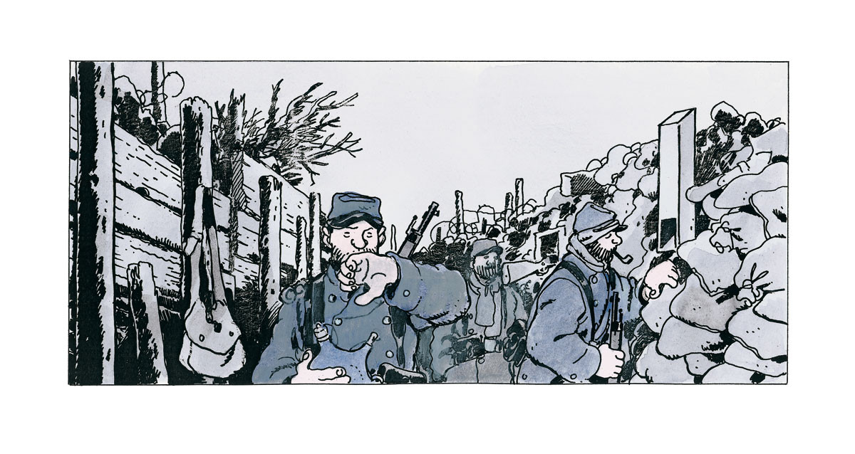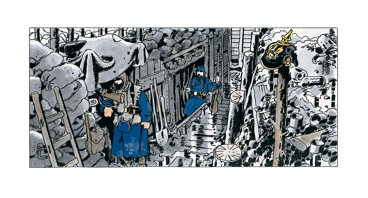 « C’est nous les petits soldats français sous un soleil de plomb, les pieds dans les champs de blé, la tête au champ d’honneur, la trouille au ventre et la merde au cul. » Tant dans le récit que dans le dessin, Jacques Tardi ne s’attarde pas sur l’Histoire avec un grand H mais se concentre sur les hommes qui l’ont subie. Gamin, celui qui a perdu deux aïeux lors de la « Der des Ders » est à la fois terrorisé et fasciné par les récits de sa grand-mère. Ses premiers pas en tant que dessinateur raconteront déjà l’horreur et donneront deux albums majeurs d’une œuvre hantée par le conflit : Putain de guerre et C’était la guerre des tranchées. Cette exposition propose surtout de découvrir des planches et des grands formats de ces deux ouvrages. Les illustrations de Tardi retracent ici le quotidien et l’incrédulité des combattants les pieds dans la boue, sous la menace de la pluie et des obus. Le trait singulier et sombre centré sur les personnages renforce la dureté et la noirceur des affrontements où ne subsiste bien souvent que la couleur rouge du sang. L’occasion de partager une vision singulière de la guerre, éloignée des chiffres et des statistiques, mais basée sur le travail historique d’un éternel indigné.
