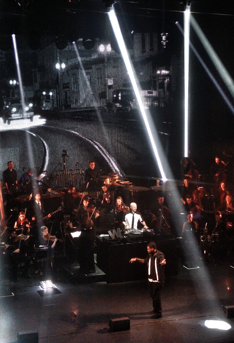 Si l’on connaît l’appétence des Djs pour les grands écarts musicaux – parfois malheureux – Wax Tailor évite les écueils de l’exercice en parvenant à se renouveler sans se trahir, c’est-à-dire sans jamais renier les racines urbaines de sa musique tout en laissant – largement – ouvert le champ de l’expérience. On le sait, l’artiste-producteur a toujours marié les genres mais, cette fois, l’ajout d’un orchestre symphonique – dirigé par la chef lilloise Lucie Leguay – donne une dimension quasi épique à son univers musical. Celui-ci oscille entre hip-hop, pop, jazz, classique et est élégamment parsemé de samples de dialogues de vieux films américains – une autre référence du Français. Sur scène, la projection d’extraits cinématographiques et d’effets visuels 3D (assez réussis) entretient un dialogue tacite avec les instruments, jusqu’à troubler le spectateur, qui ne sait plus vraiment s’il voit du son ou écoute des images. Disons qu’il phonovisionne.