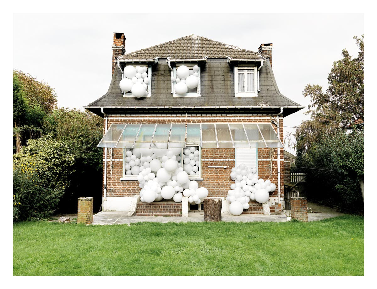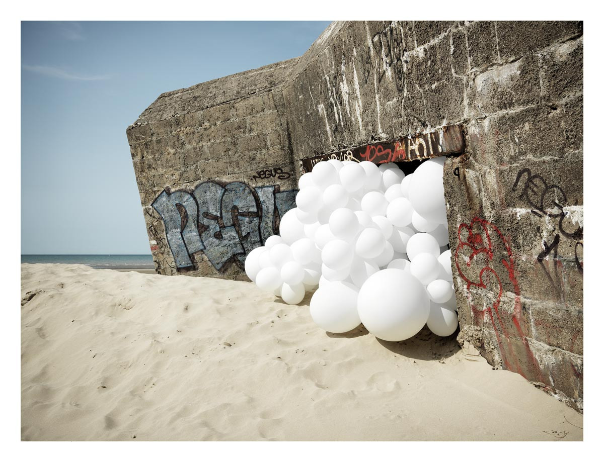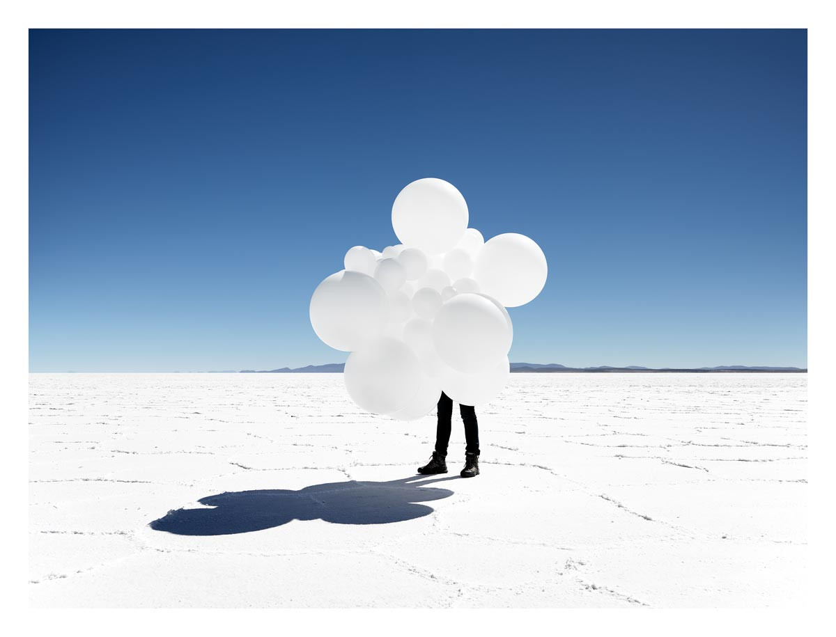 Une « guirlande » joyeuse flotte au dessus d’une plage, un « nuage » suspend son vol au cœur d’une forêt, un torrent de « bulles de savon » surgit de la façade d’une maison abandonnée. Depuis 2005 et les balbutiements de son travail d’art appliqué, Charles Pétillon parcourt le monde avec sa grappe de ballons immaculés, faisant du littoral dunkerquois ou du désert salé de Bolivie le terrain de ses expérimentations surréalistes. « Le début d’une histoire, cela peut être un lieu, un thème, un ensemble de mots », explique cet ex-assureur, qui a façonné son goût pour l’image auprès de Jean Larivière et officie, à la ville, comme photographe de nature morte.
