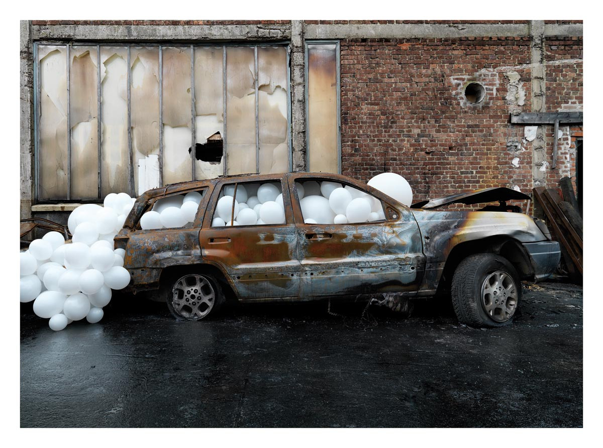 Mais pourquoi le ballon ? « Parce qu’il est accessible, y compris à un enfant, note l’artiste. Même si tout ça n’est qu’un prétexte ». Dans un local à poubelles d’une propreté clinique à Dubaï, ses baudruches, baptisées « Outrances », pointent l’absurdité de la course à la consommation. Ou, à l’inverse, saluent l’action de l’homme en jaillissant de la piscine tournesol de Sin-le-Noble (près de Douai). « Ces piscines ont envahi l’espace public dans les années 1970, avec l’objectif d’apprendre aux petits Français à nager. Je voulais garder le souvenir d’un bâtiment emblématique amené à disparaître », précise Pétillon, tout en rappelant humblement sa condition. « Je ne cherche pas à apporter des réponses, je ne suis qu’un gars qui prend des photos. » Et qui vient apporter, de façon salutaire, un peu de légèreté dans notre quotidien.