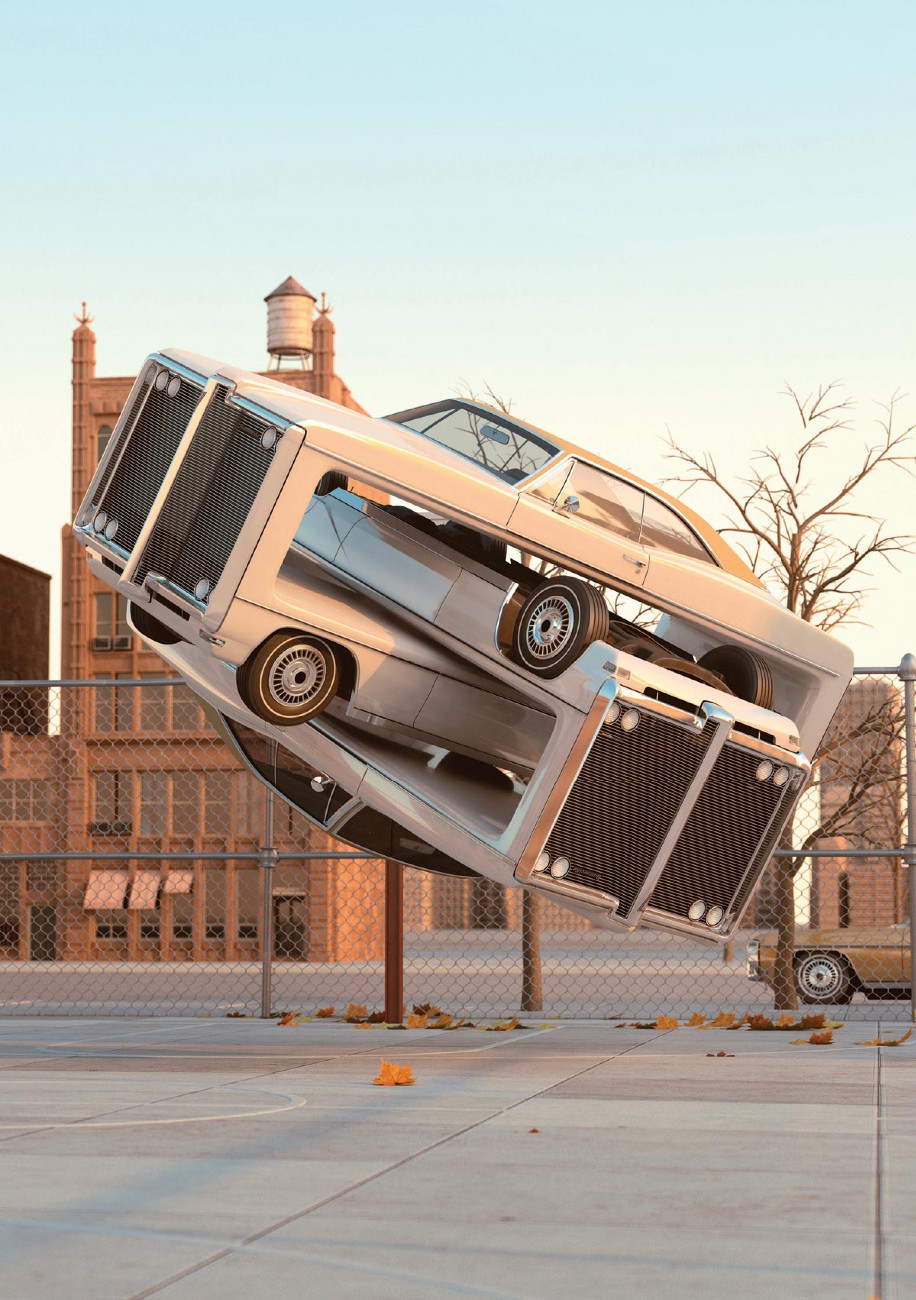 Chris Labrooy aurait pu assouvir sa soudaine fascination pour les voitures à travers les joies du tuning… mais non ! Il préfère les imbriquer et les tordre dans tous les sens comme des jouets. Le résultat est assez étonnant. Des structures monumentales constituées de berlines ou de pick-ups américains trônent sur des parkings ou flottent dans les airs. De splendides œuvres digitales, si réalistes qu’elles paraissent vraies. « Je travaille dur pour réaliser une photo qui semble réelle. J’aime piéger le public, confie ce designer et illustrateur d’origine écossaise. D’ailleurs, je reçois beaucoup d’emails de gens qui souhaitent voir ces sculptures, persuadés qu’elles existent ! ». Évidemment, tout est virtuel. « La photographie est parfois utilisée comme référence, mais l’ensemble est créé en 3D par ordinateur ». Ainsi, pour la série Auto Aerobics, Chris a modélisé les terrains de basket et les bâtiments en grès brun typiques de Brooklyn, à New-York. « J’utilise des paysages familiers car ils maintiennent une tension entre l’ordinaire et l’extraordinaire ». Ce directeur artistique reconnaît sa passion pour la technologie numérique, qui lui octroie une liberté totale : « si vous pouvez l’imaginer, alors vous pouvez le créer », clame-t-il. « En travaillant de cette façon, je peux contrôler tous les éléments qui servent une composition : la météo, l’intensité de la lumière et des ombres, les matériaux, les surfaces… ». Sa prochaine série aura pour cadre Tokyo. Chris veut désormais « explorer la riche culture automobile japonaise ». Roulez jeunesse !