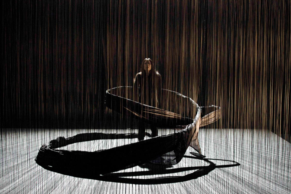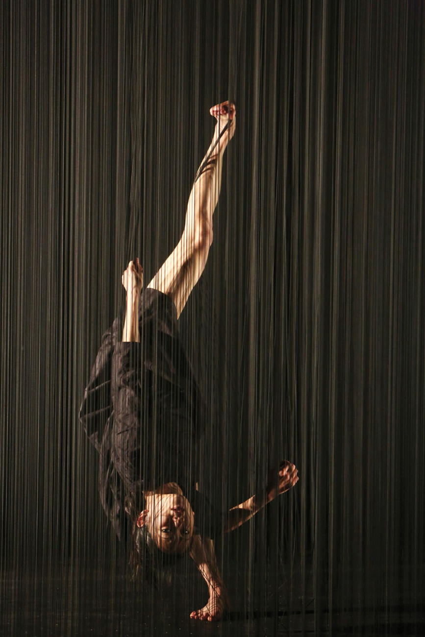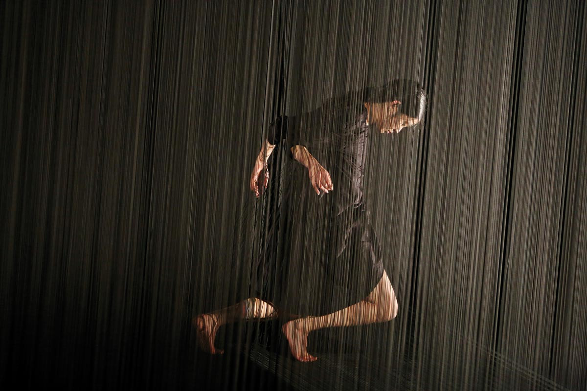 L’architecture de Plexus se bâtit comme un réseau, une forêt de cinq mille fils où la danseuse flotte, tente de se déplacer. Un décor qui s’écrit en clair-obscur : « L’ombre est très importante au Japon. Elle enveloppe des esprits, c’est inquiétant, évanescent ». Fluette silhouette évoluant tout en grâce, Kaori Ito s’y révèle tour à tour présence fantomatique et pantin désarticulé. La pièce reflète son monde intérieur et l’espace dans lequel elle lutte pour trouver sa place. « Elle y est enfermée comme à l’intérieur de son propre corps ». Elle se débat lentement, suspendue entre ciel et scène. D’une certaine manière, c’est aussi un anti-portrait, un effacement progressif de l’interprète. Et une réflexion sur la condition humaine.