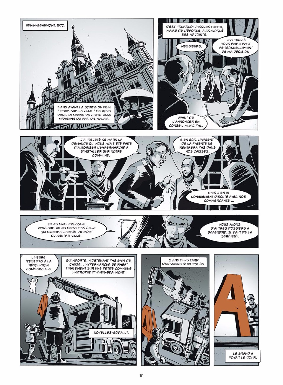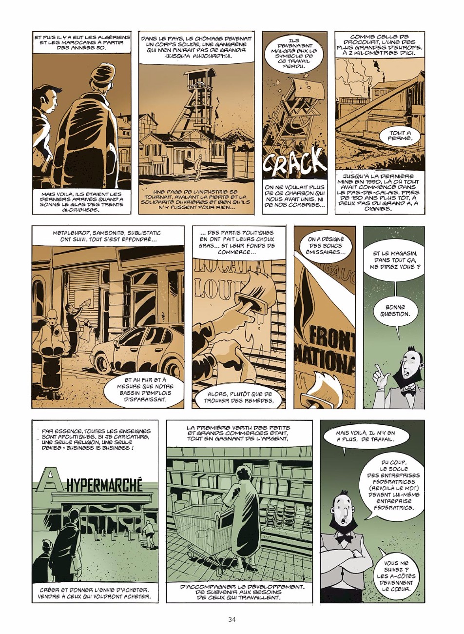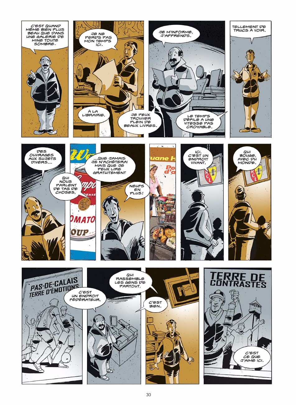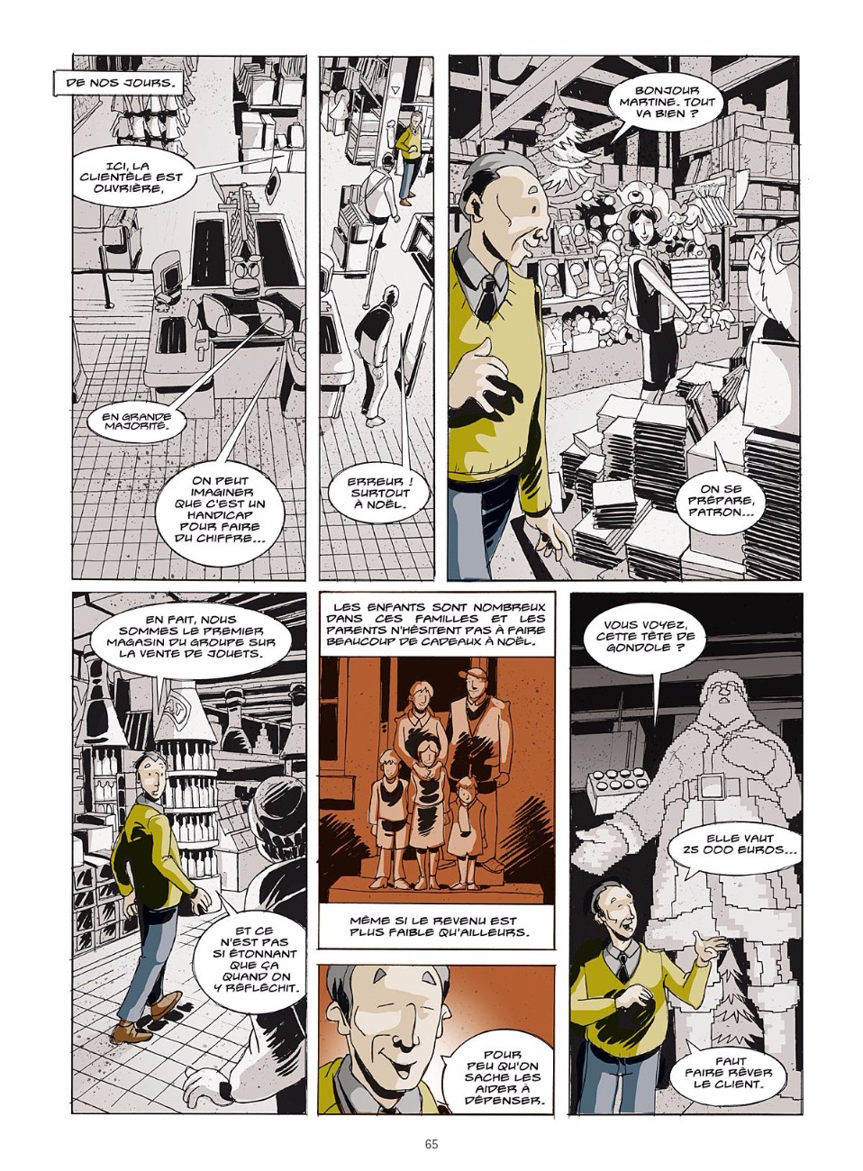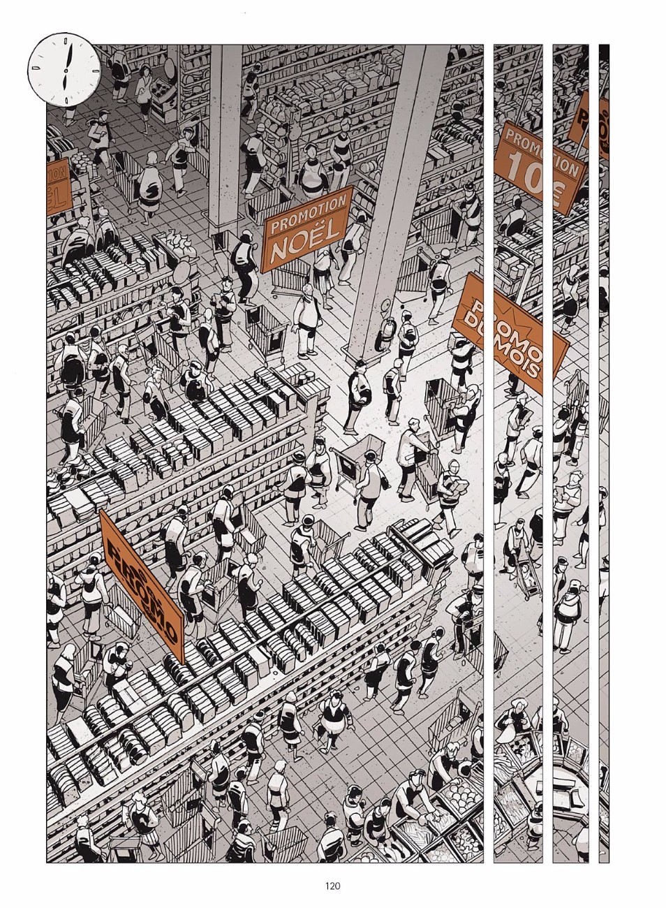 Fresque – La BD se lit comme une fresque alternant souvenirs de jeunesse du dessinateur après l’implantation de l’hyper dans les années 1970, exploration actuelle du lieu et intermèdes historiques sur le commerce. « Suite à nos multiples rencontres, nous avons esquissé un portrait en creux de ce grand magasin et, à travers lui, d’une ville en déshérence ». Dans ce drôle de jeu des serpents et des échelles on croise, pêle-mêle : un solitaire qui dévore chaque jour des livres à l’oeil chez Cultura, une ex-petite amie devenue caissière, un directeur dont le parcours de self-made man entretient l’illusion collective que tout un chacun peut monter en grade, des vigiles et des voleurs, des bijoutiers prêts à tout pour endetter des clients sans le sou, des petits commerçants excédés par la concurrence déloyale et la présence d’étrangers qui feraient, soi-disant, « fuir la clientèle ».