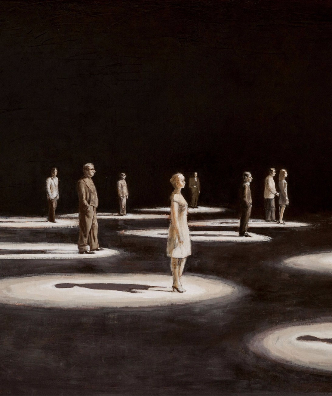 La peinture figurative, ou l’art de peindre en s’appuyant sur les objets (et les figures) du réel. Prenons par exemple les personnages tragicomiques de Goran Djurovic, qui parlent à des écrans vides ou s’isolent au milieu d’une foule, évoquant la difficulté de vivre ensemble. Ou encore les masques caricaturaux mais terriblement expressifs de François Jacob, les êtres effacés de Julien Spianti… Un troublant reflet de notre époque à découvrir lors de trois expos, jusqu’en janvier.