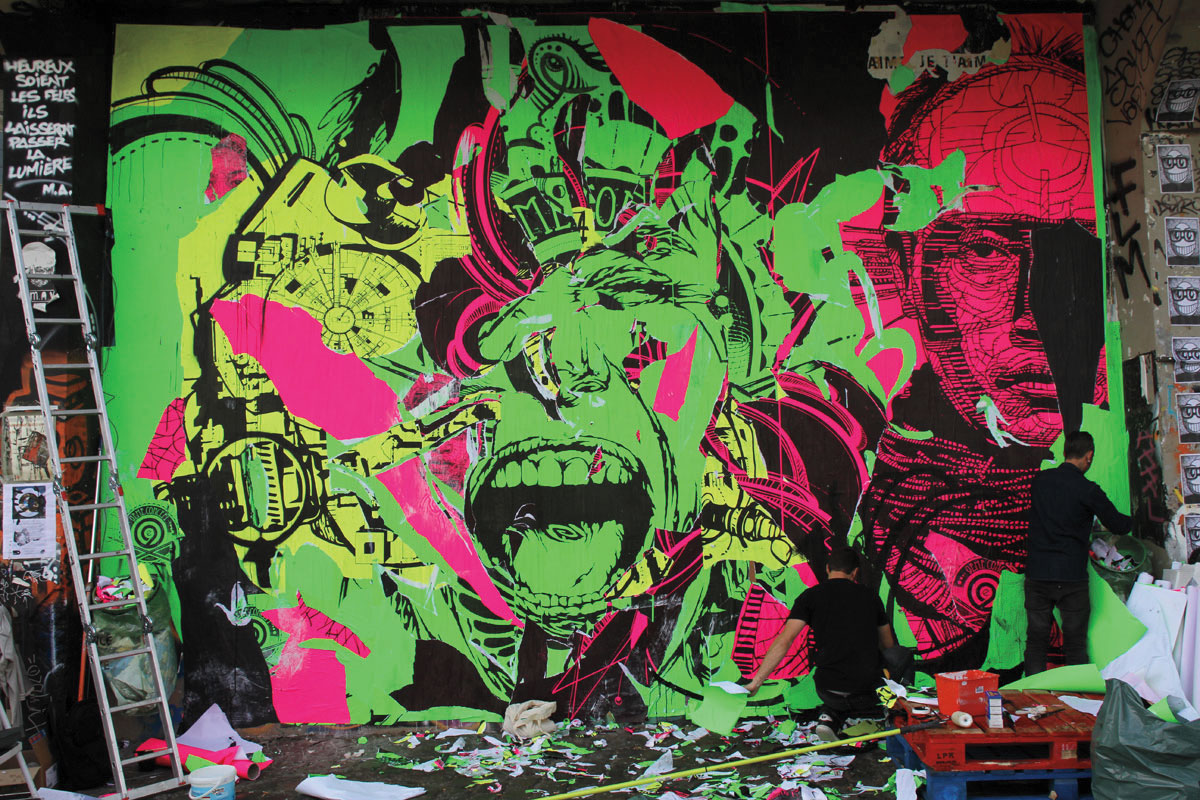 9ème Concept, c’est d’abord l’histoire de trois potes. Stéphane Carricondo (lire notre article paru dans le numéro 59), Jerk45 et Ned se sont croisés à l’orée des années 1990 dans une école de graphisme parisienne – qu’ils ont vite quittée. Trois types qui ne partagent pas les mêmes goûts – l’un baigne dans le hip-hop, les deux autres dans le punk ou la BD – mais sont d’accord sur une chose : « prouver qu’on peut gagner sa vie avec la peinture », selon Stéphane. Surtout, ils ont une conception forte de leur art : le rendre accessible au grand public, gratuitement et sans attendre le concours d’un galeriste. Ils sont ainsi parmi les premiers à recouvrir Paris de stickers. Un support qui ne les quittera plus. « On en a imprimé plus de 3 000 modèles… Pourquoi les autocollants ? Parce qu’on peut les donner et se les échanger ».