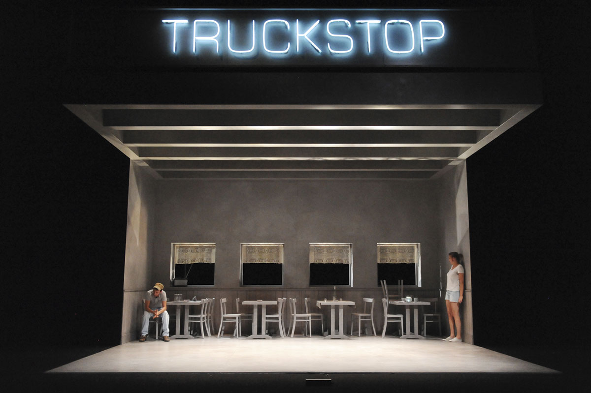 Construit comme un polar dont le dénouement est d’emblée révélé, ce texte de Lot Vekemans nous invite dans un bar routier tenu par une mère et sa fille. Un jour, un camionneur désoeuvré séduit la jeune femme, lui promettant un avenir loin du Truckstop, au grand désarroi de sa maternelle… Au matin du 16 juin, tout s’arrête brutalement. Mis en scène par Arnaud Meunier, cet huis clos aborde les questions sociales déchirant notre société mondialisée, laissant les plus faibles au bord de la route.