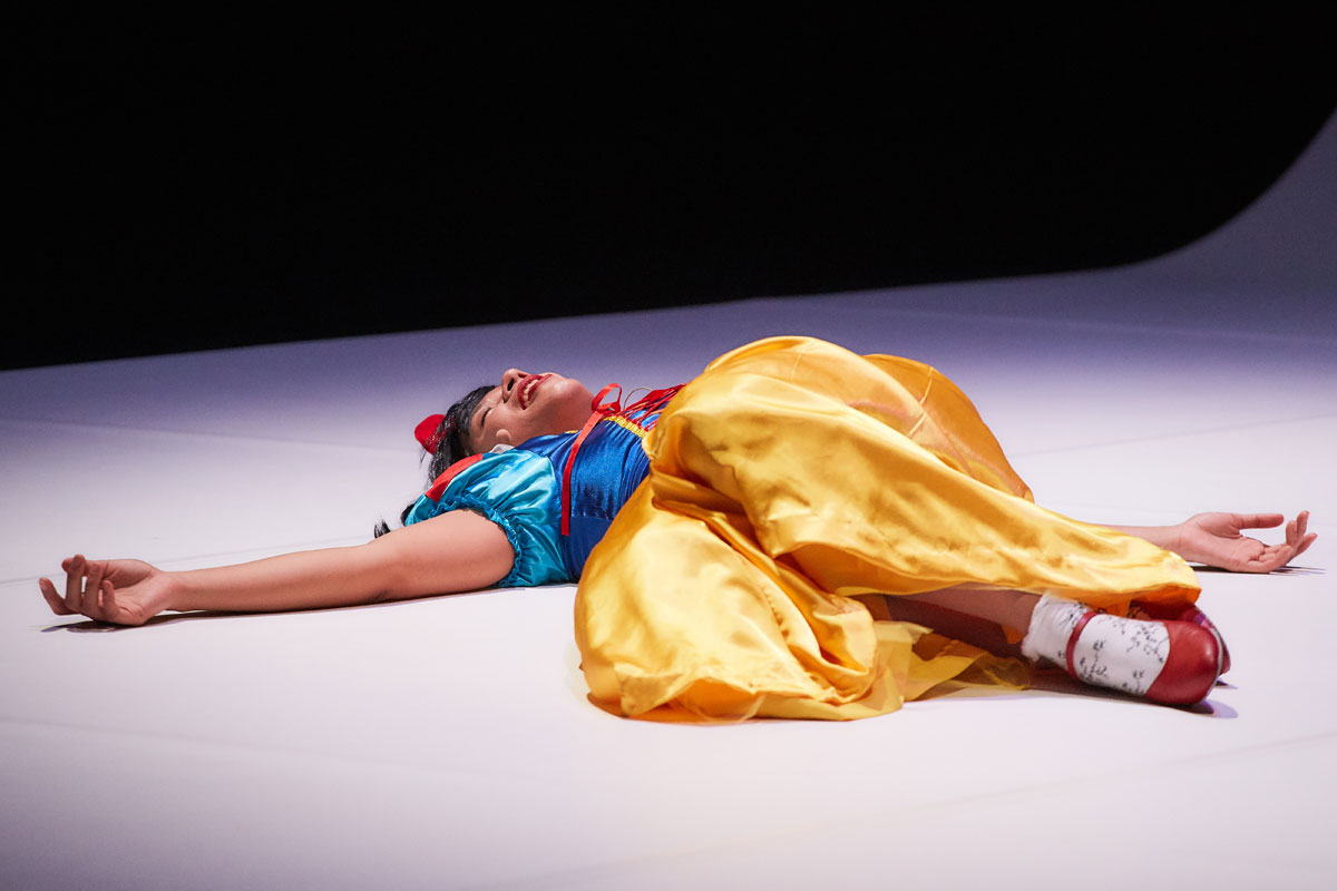 Dans Votre altesse, Eisa Jocson dénonçait la marchandisation du corps à Disneyland Hong Kong. Elle est de retour chez Mickey, pour s’attaquer à une autre icône : Blanche-Neige. Eh oui, à cause de leur couleur de peau, les danseurs philippins sont cantonnés dans le parc d’attraction à des rôles mineurs. Mais dans cette pièce, la princesse n’est pas incarnée par une actrice blanche… Réécrivant un récit préprogrammé, elle dézingue ainsi un langage corporel et un comportement stéréotypés.