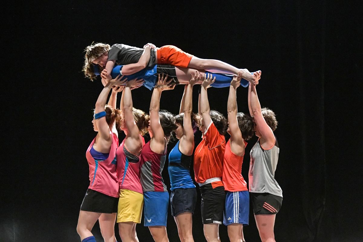 Au départ, il y a Laurence Boute. Cette circassienne et comédienne avait rassemblé 25 artistes femmes pour partager une semaine de rencontres sur le porté acrobatique à la Grainerie, fabrique des arts du cirque de Toulouse. Puis l’aventure s’est poursuivie, jusqu’à constituer un collectif. Le Projet.PDF (pour “Portés de femmes”) est ainsi né de cette envie commune « de casser cette image du gros porteur et de la petite voltigeuse ! » précise la Française. Elles sont 16 à présent, dans un spectacle construit collectivement avec la metteuse en scène Virginie Baes. Elles y déroulent un programme impressionnant, tout en acrobaties portées, enchaînement de saltos, pyramides humaines ou danses de groupe. à la faveur de tableaux successifs, on assiste à une partie de chasse surréaliste, un clin d’œil à Pina Bausch ou à l’exécution d’un ballet de natation synchronisée. Les chairs s’y déploient sous des facettes multiples, tour à tour teintées d’humour ou revêtant une tonalité plus sombre. Avec une bonne dose d’autodérision sur des sujets comme la maternité, le collectif dédramatise le corps féminin en le dénudant, l’empoignant et nous invitant à élever le débat.
