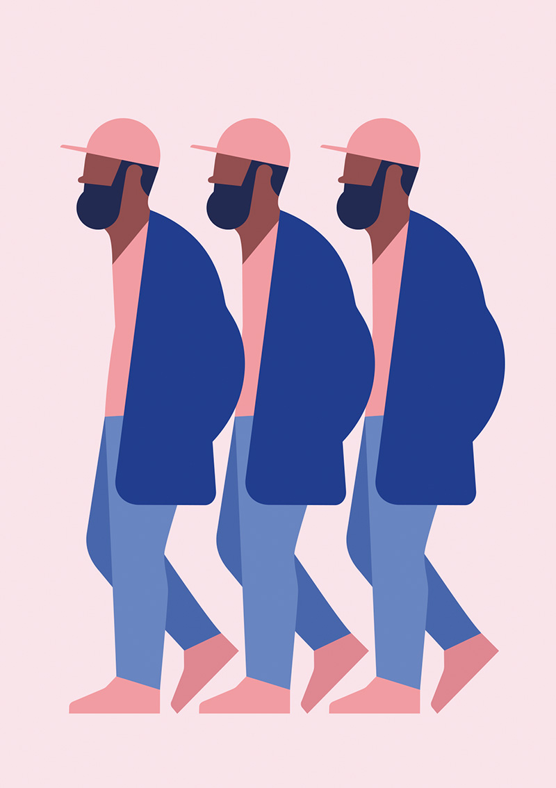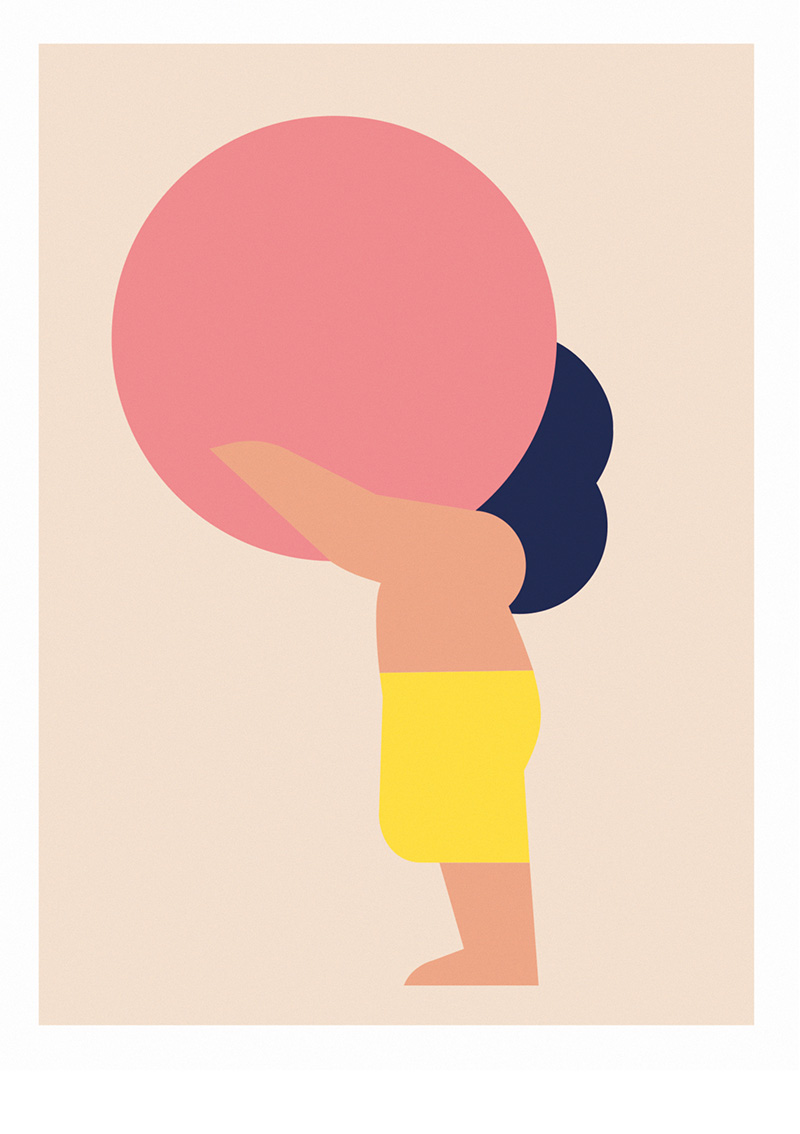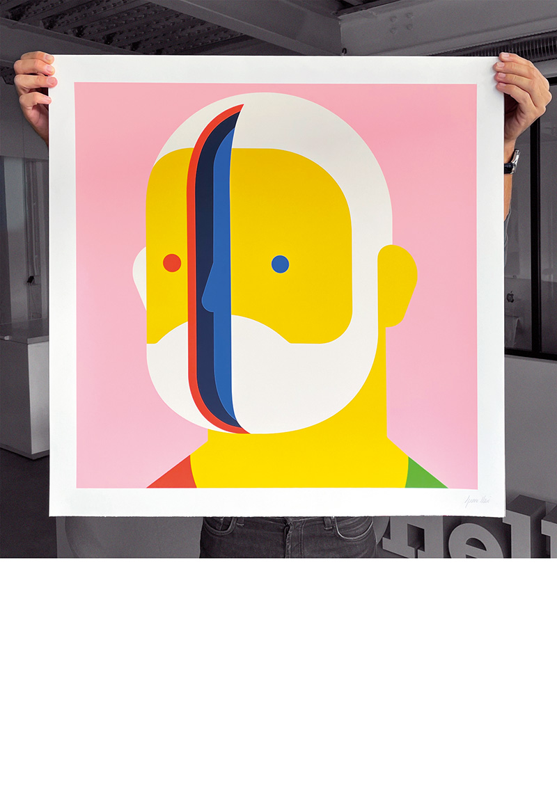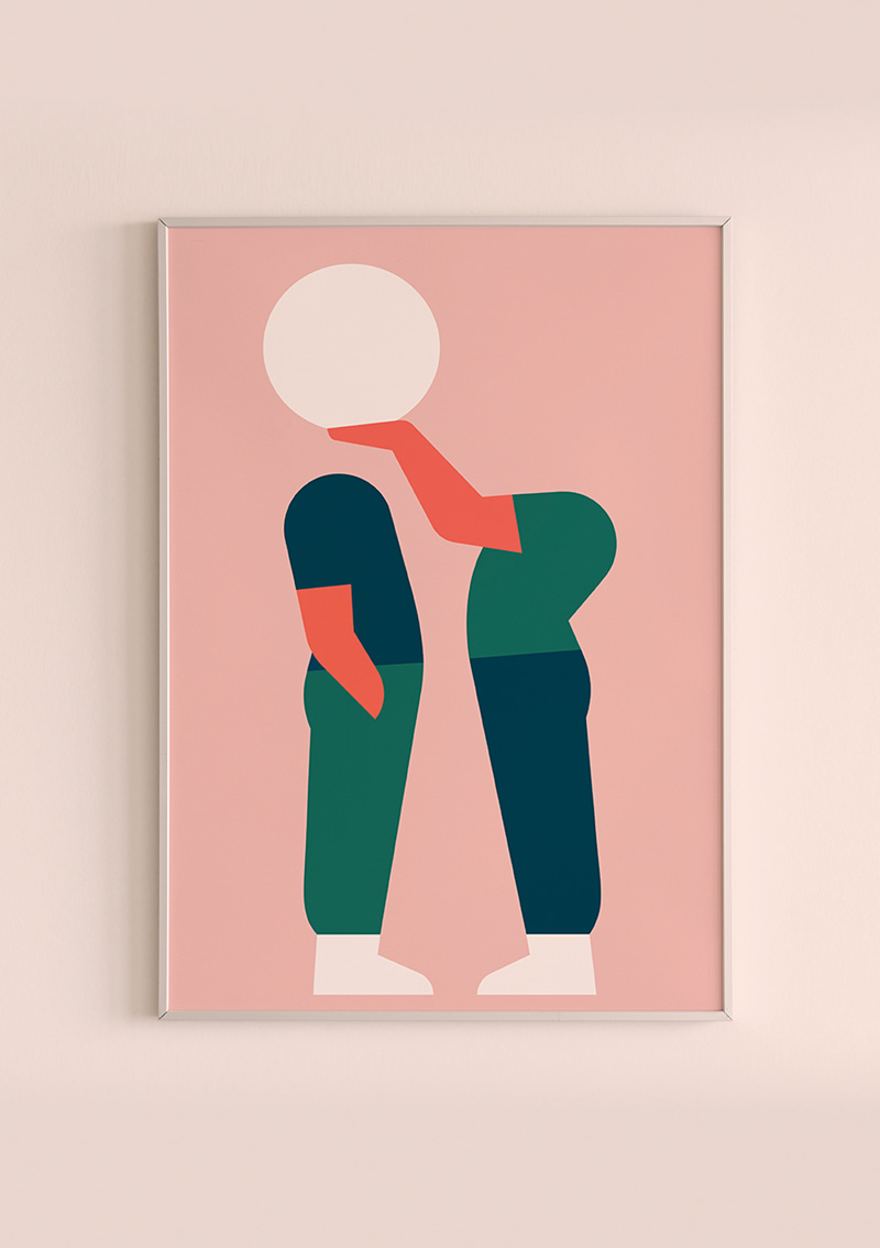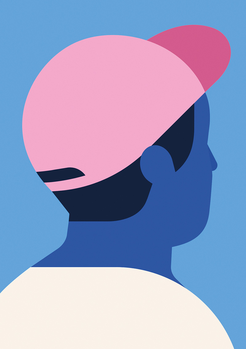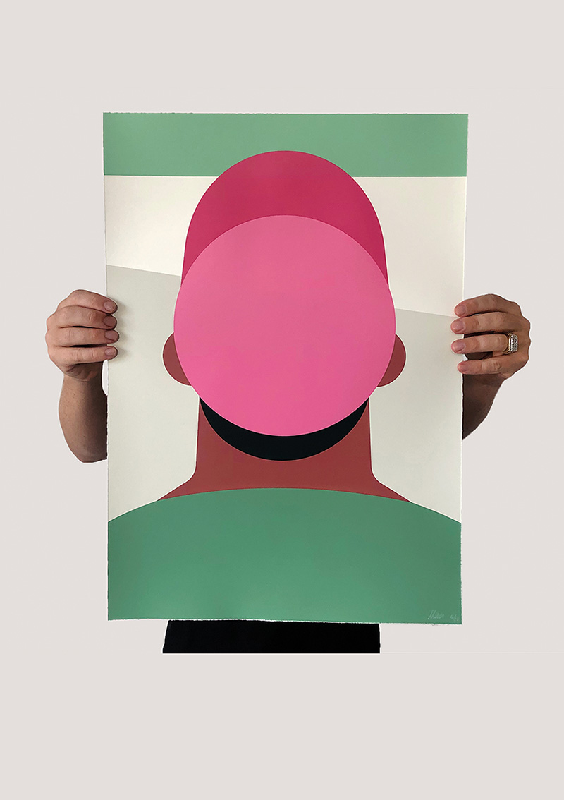 Parmi notre sélection, certaines œuvres ont-elles une signification particulière ? Les trois hommes qui marchent figurent l’évolution, le changement, le fait d’avancer dans les étapes de la vie. La sérigraphie représentant un homme de dos, coiffé d’une casquette rose, frôle l’abstraction et questionne le fait d’être au pied du mur. Je l’ai baptisée Behind the Wall et l’ai récemment vendue aux enchères. Citons également cette création montrant deux personnages se passant une tête en forme de lune. Celle-ci illustre l’empathie, la communication, le fait de mieux comprendre l’autre. Plus généralement, il y a les casquettes, le ballon, qui ont aussi trait à l’enfance. Le rond est très présent dans mon travail, il permet d’attirer l’œil à un endroit de l’image. J’ai toujours voulu utiliser les aplats et je fonctionne par système de couleurs. J’en utilise rarement plus que trois, dont une plus foncée pour faire ressortir le reste. Tout est question d’équilibre, d’harmonie et de contraste.