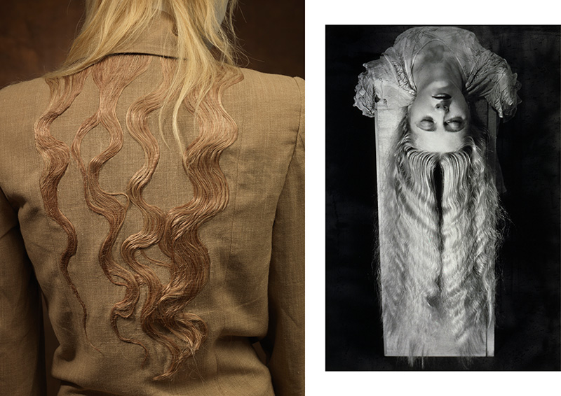 Puisque nous sommes dans un temple de la mode, les vêtements sont les autres stars du parcours au MoMu. Ceux qui ont été photographiés, et que l’on peut découvrir “en vrai” dans une scénographie tout en ombres et lumières (signée Madeleine Vionnet et Augusta Bernard). Mais surtout ceux qui empruntent au travail de Man Ray. Au milieu de quelques meubles et sculptures issus du courant dada, comme Le Cadeau (1921), un fer à repasser hérissé de quatorze punaises, les stylistes belges, nourris de surréalisme, revendiquent plus que jamais cet héritage. Outre Dries Van Noten, citons ainsi ce blazer décoré de longues mèches blondes par Olivier Theyskens, calqué sur La Chevelure (1927). Ou encore l’avantgardiste Martin Margiela, assumant la référence à l’Américain dès son premier défilé, et qui a toujours tendu des ponts entre l’art et la mode, comme son illustre aîné.