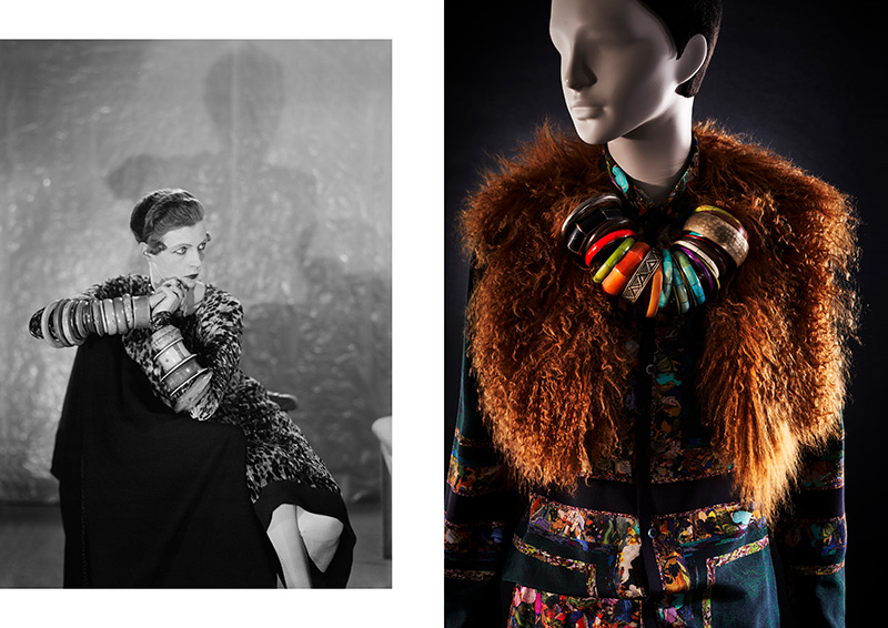 Avant lui, « la représentation des vêtements se résumait à des illustrations sur du papier de mauvaise qualité. Man Ray a quasiment inventé la photo de mode, grâce à des procédés innovants », ajoute Romy Cockx. À Anvers, ces portraits de commande, dont 80 ont été prêtés par le centre Pompidou, constituent l’essentiel des 300 oeuvres exposées. Et que ce soit dans les silhouettes en surimpression, l’utilisation de la solarisation ou ces compositions étranges qui isolent certaines parties du corps pour Harper’s Bazaar, l’artiste prend le pas sur l’exécutant. En 1926, il shoote telle une muse l’autrice Nancy Cunard et ses avant-bras lourds de bracelets. Un cliché dont s’inspirera d’ailleurs Dries Van Noten pour créer un ensemble tunique, gilet en fourrure et imposant collier, présenté ici en reflet.
