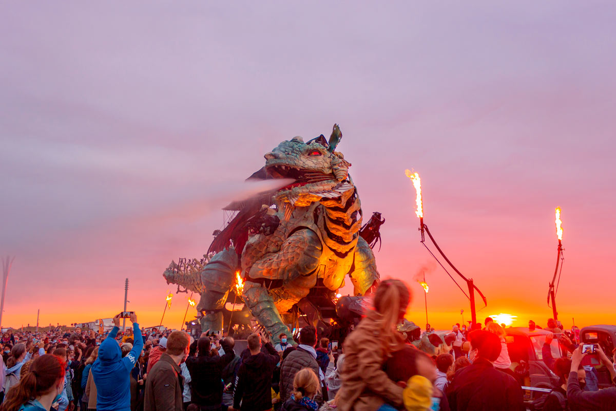 Ah ! Calais. Sa plage de sable fin, ses moules-frites, ses fricadelles et… son dragon, pardi ! Créé en 2019 par le génial François Delarozière, ce monstre tout en acier et bois sculpté fait désormais partie du paysage de la ville portuaire – comme le Grand éléphant à Nantes ou le Minotaure à Toulouse. Il faut dire que notre géant de 72 tonnes et de 25 mètres de long est du genre sympa, embarquant le public sur la plateforme panoramique intégrée à son dos pour des voyages le long du front de mer. Après une longue période d’hibernation, le colosse-automate a repris son petit train-train en février, et s’apprête désormais à fêter le solstice d’été… jusqu’en septembre ! Au programme ? Des concerts chaque vendredi soir face à la Manche (avec la folkeuse Moma Elle, le duo ragga-dub Undersonic, entre autres), des barbecues tous les samedis (rassurez-vous, ce n’est pas lui qui les allume !), des journées d’apprentis soigneurs pour les dragonniers en herbe et, bien sûr, des promenades nocturnes à dos de saurien. Pour un été tout feu tout flamme ? On peut le dire.