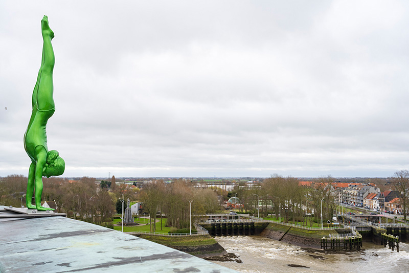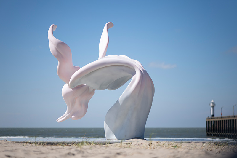 La côte belge ne manque pas de charmes, sublimés par le regretté Arno, comme chez lui à Ostende où la rue longue « pleure des bières et des espoirs ». À bien des égards, ce rendez-vous est tout aussi enivrant. Pour la huitième édition de cette Triennale, neuf stations balnéaires du littoral se parent six mois durant d’œuvres contemporaines. Tandis que le parc de Beaufort réunit une quarantaine de pièces conçues lors des précédents festivals, cette balade nous emmène de La Panne à Knokke. Signées par 18 artistes internationaux, ces sculptures et installations suscitent la contemplation comme la réflexion. C’est par exemple Top Down / Bottom Up de l’Allemande Alexandra Bircken. Visible à Nieuport, cette statue verte en aluminium figure une jeune gymnaste. En équilibre sur la pointe des pieds, les bras tendus vers le ciel, l’adolescente évoque une Atlas moderne, condamnée à porter le poids d’un monde s’effondrant chaque jour un peu plus… Citons aussi cette montagne de chaises faussement en plastique de la Finlandaise Sara Bjarland. Posé sur la plage de Wenduine, cet empilement surréaliste dénonce avec ironie l’ère du “tout-jetable” et la pollution de nos mers. En somme, beau et fort.