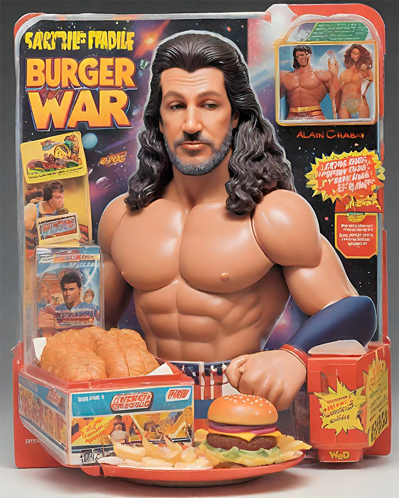 Voilà un moment que ce mystérieux blagueur fait se poiler les réseaux sociaux, dispensant ses aphorismes sous les traits d’Étienne Dorsay. Mais si : le héros d’Un Éléphant ça trompe énormément, incarné par Jean Rochefort dans les 70’s. Ce qui nous intéresse ici, ce sont ses figurines conçues avec l’IA, fruits d’un improbable croisement entre Burger Quizz et Action Man, qui s’affrontent « pour le Burger et pour le pire ». Oui, ça va buzzer.